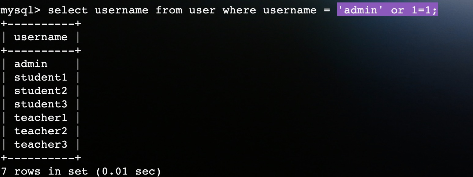 但是因为这里使用了拼接字符串的方式,对于input没有校验,如果我在传入username的同时,也传入了一些其他的字符串,就会查到其他用户的信息。在上面的SQL中,我们使用了where条件,我们知道在多个条件中,可以使用AND 和 OR 来连接。