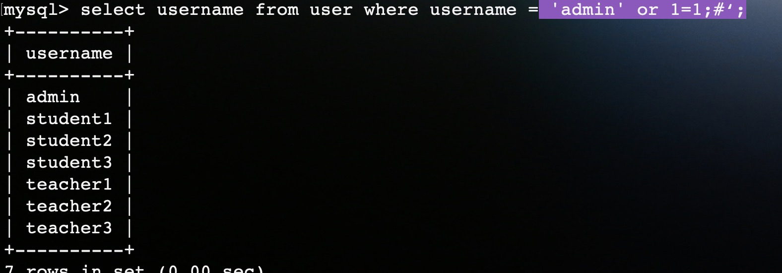 那么,如果想要在上面后台程序中加入这样的代码逻辑,需要传入 'or 1=1# 。单引号是为了闭合 username 的条件, 最后的#是为了注释代码中的最后一个单引号,SQL如下图所示。