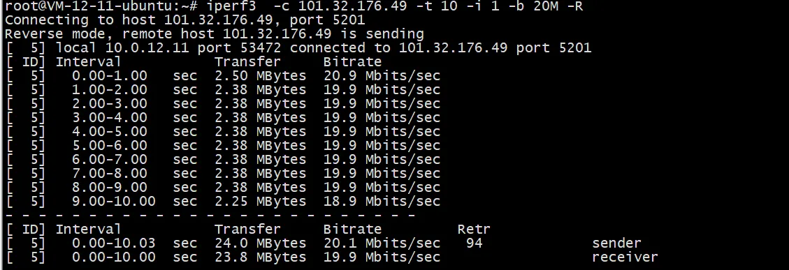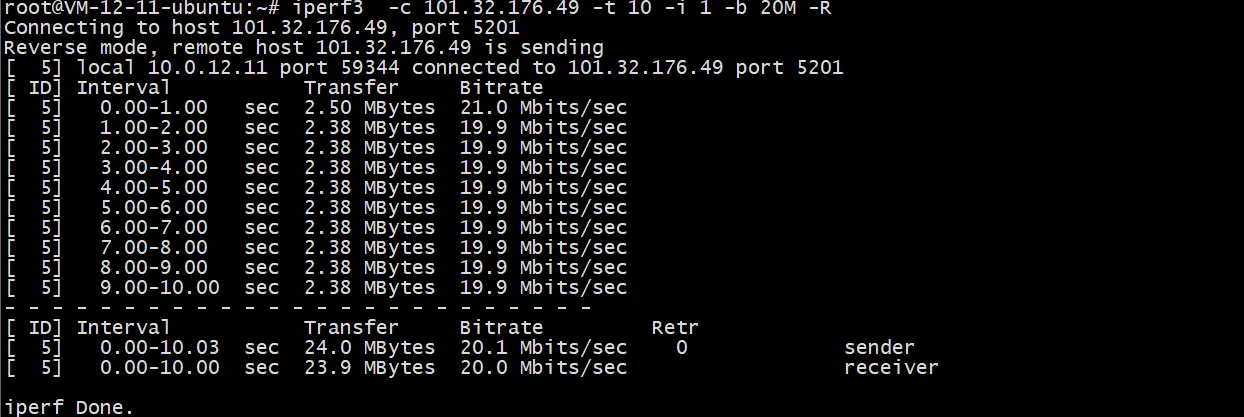 iperf3 -c 101.32.176.49 -t 10 -i 1 -b 20M -R
