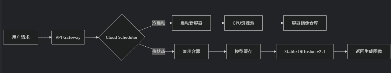 图1:Serverless容器冷热启动机制。蓝色路径展示冷启动时从GPU资源池动态调配实例的过程,绿色路径显示热状态下的请求复用。关键价值在于通过智能调度将冷启动概率控制在5%以下。