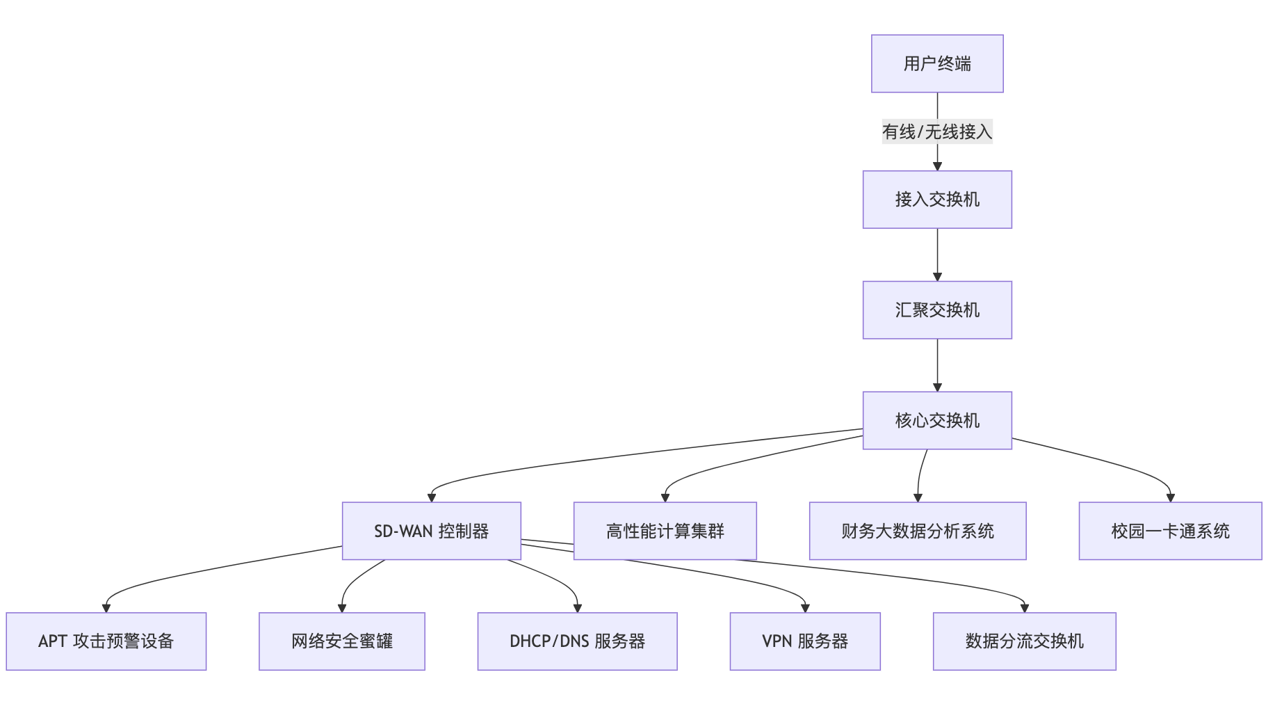 数字化校园的核心在于构建高效、稳定、安全的网络环境,以支撑教学、科研、财务管理和校园生活服务等多场景需求。本次项目主要目标是提升校园网的核心网络性能、安全性和智能化管理能力,涉及以下几个方面: