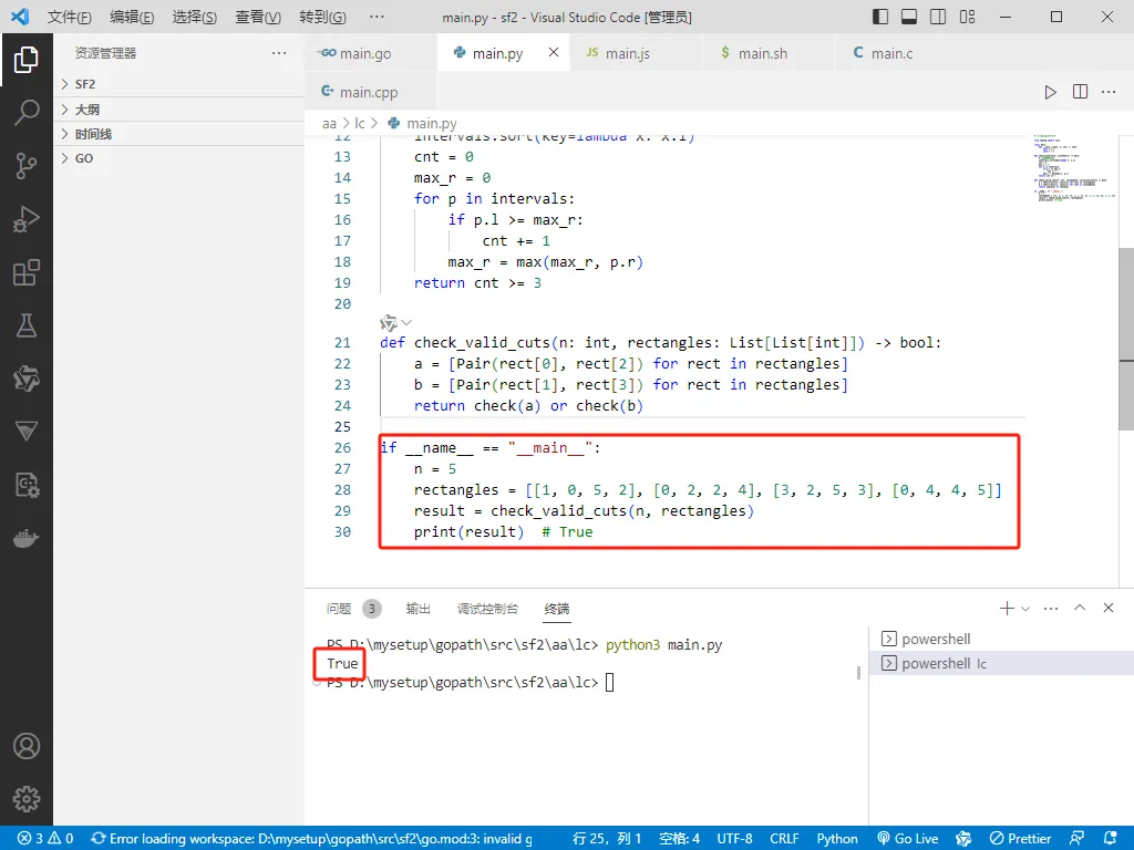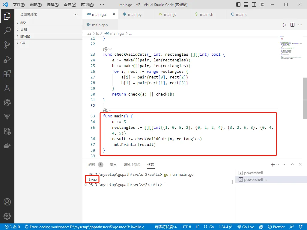 2025-07-06:判断网格图能否被切割成块。用go语言,给定一个大小为 n x n 的网格,坐标系的原点设在左下角。你有一个二维数组 rectangles,其中每个元素 rectangles[i] = [startx, starty, endx, endy] 表示一个矩形,其左下角坐标为 (startx, starty),右上角坐标为 (endx, endy)。已知这些矩形彼此不重叠。
