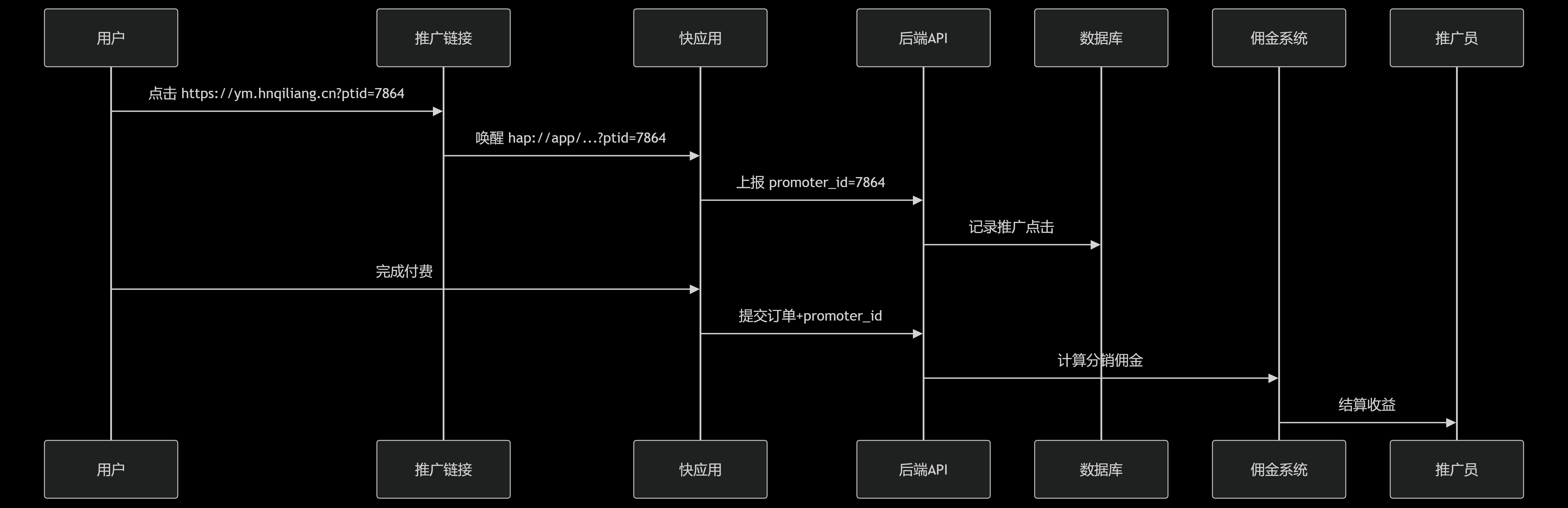 → 快应用)。通过 Deeplink 参数传递 + 后端佣金结算 + 防作弊检测,可实现快应用推广链接与自身系统的深度关联。优化推广策略(如裂变分享、渠道适配)可进一步提升转化率。