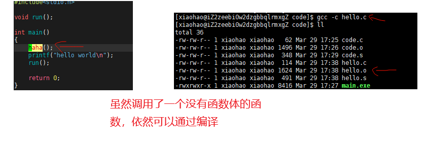 尽管调用了一个没有声明,没有函数体的函数的函数,但是编译依然没有报错。这就证明了编译器在编译.c文件时,是不认识调用的函数的,不知道函数的真实地址是多少。