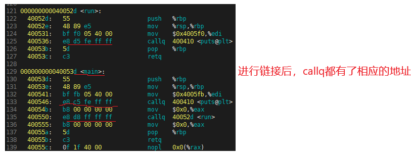 当链接后,callq 00 00 00 00的地址,全都填充为具体的值了