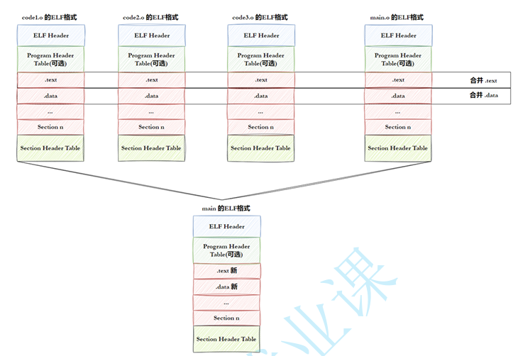 最终: 两个 .o 的代码段合并到了⼀起,并进⾏了统⼀的编址 。链接的时候,会修改 .o 中没有确定的函数地址,在合并完成之后,进⾏相关 call 地址,完成代码调 ⽤