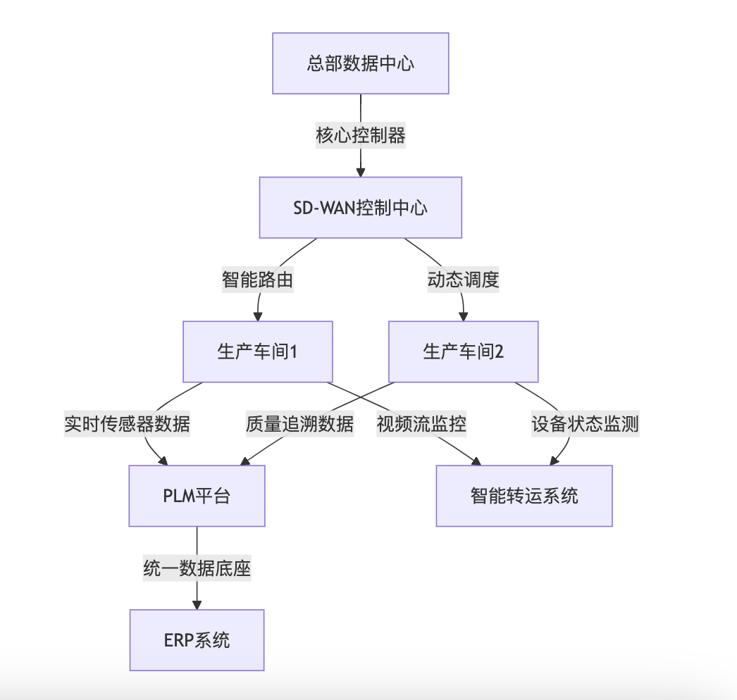 SD-WAN技术通过动态带宽分配,保障PLM、ERP等系统与生产终端间的数据实时同步,支持多站点协同生产。