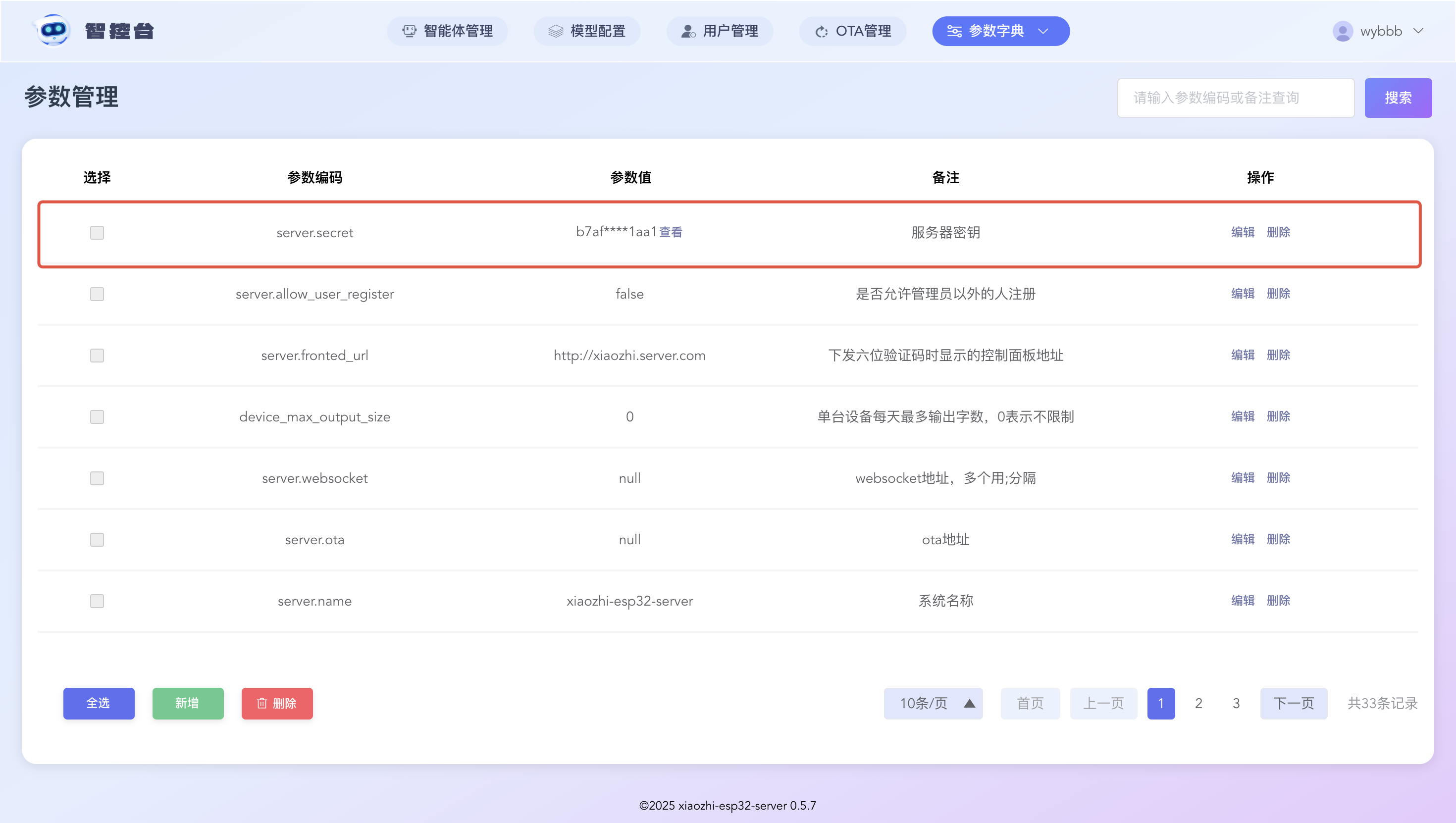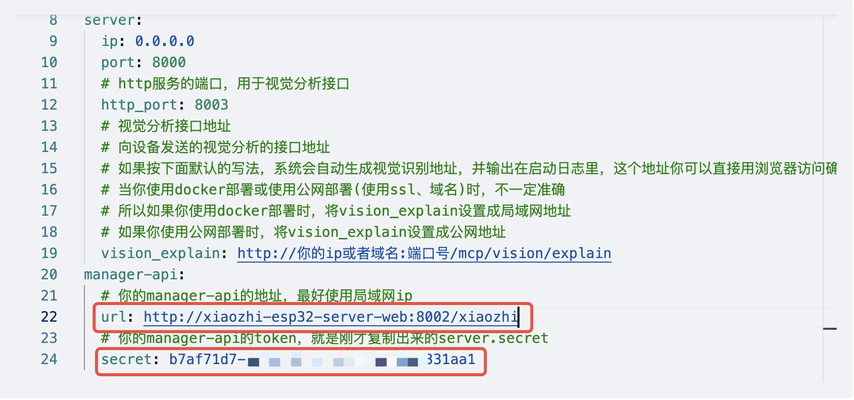 server.secret是每次从零部署管理模块时,自动随机生成的密钥,作用是让您可以通过可视化界面管理小智AI,便于我们配置应用。