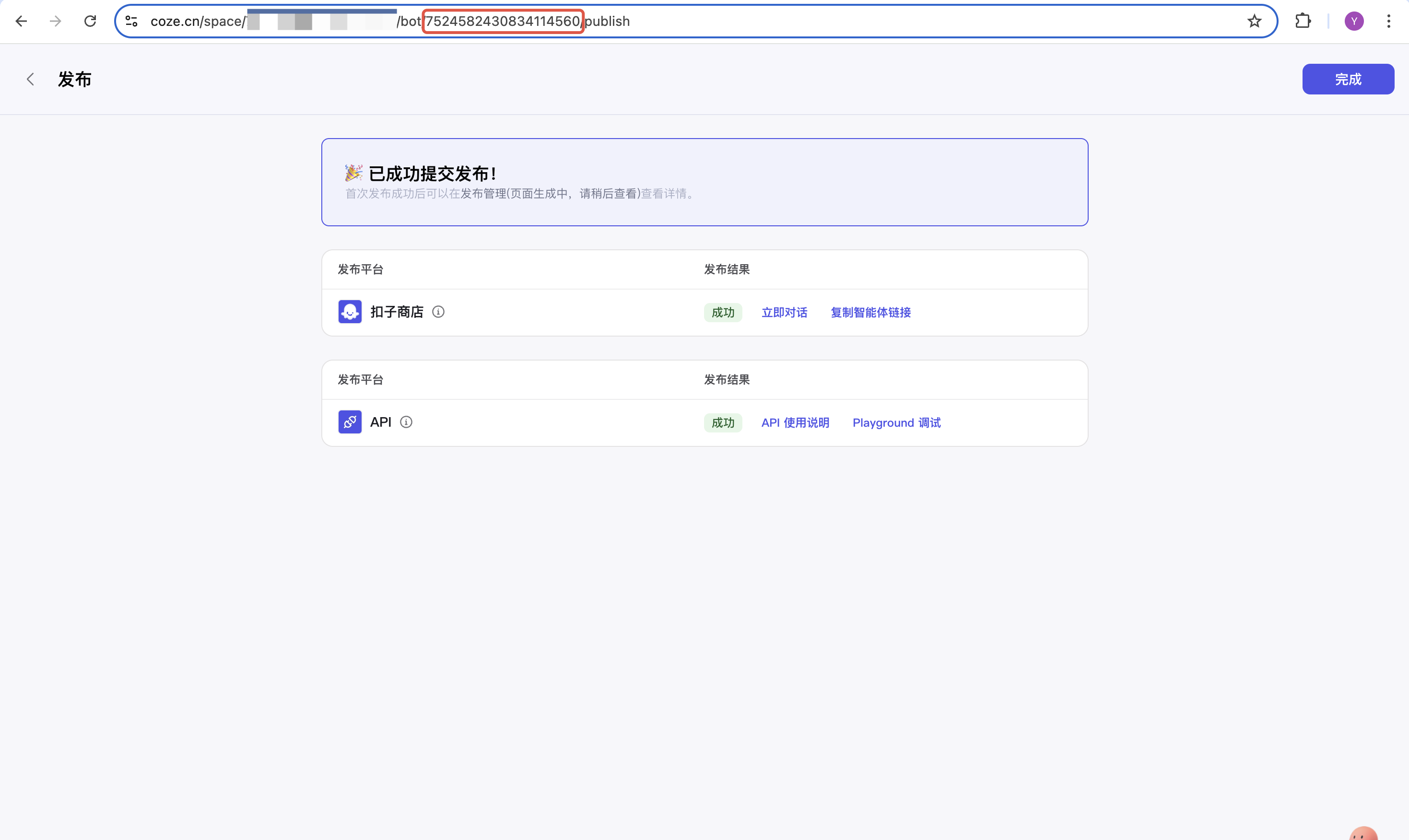 3. 记录一下智能体上方网址里最后一串字符,这个是应用的bot ID,就像是应用的身份证号,记录这个才能让他正常工作。