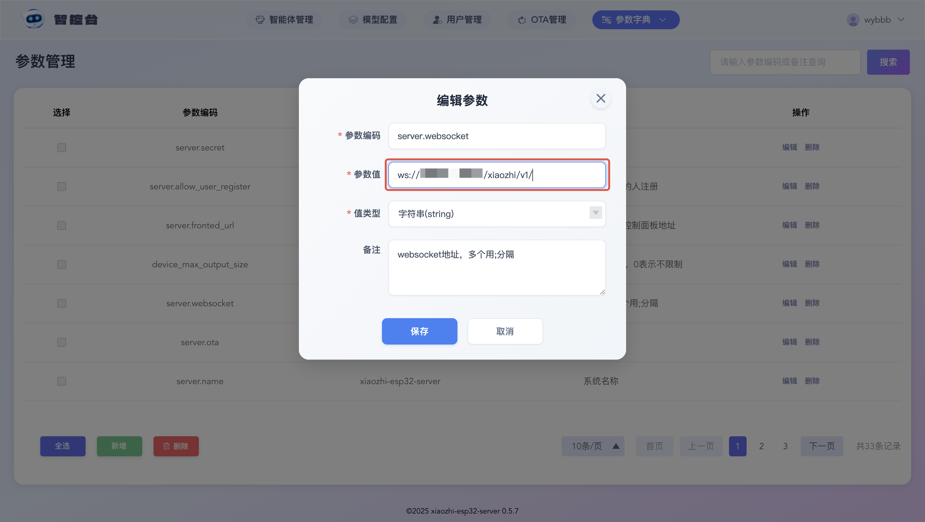 12. 再次进入智控台,在顶部菜单找到参数管理,点击参数编码 server.websocket 的【编辑】。将参数值修改为ws://实例公网IP:8000/xiaozhi/v1/,点击【保存】。