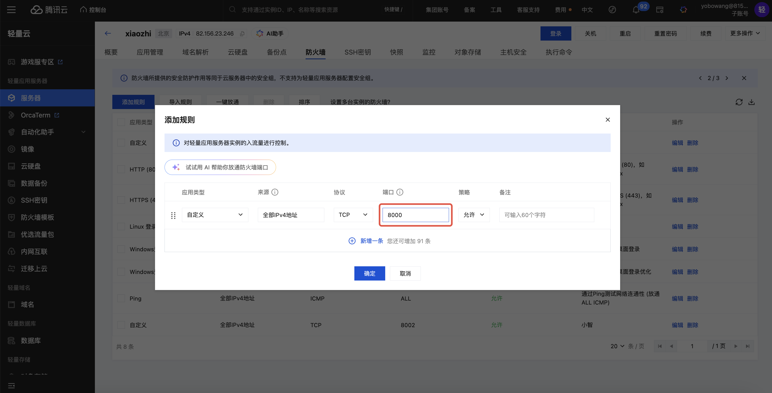 10. 为了让小智AI能正常的运行,我们需要在控制台放通8000端口。这个端口将用于连接小智AI的 websocket地址。