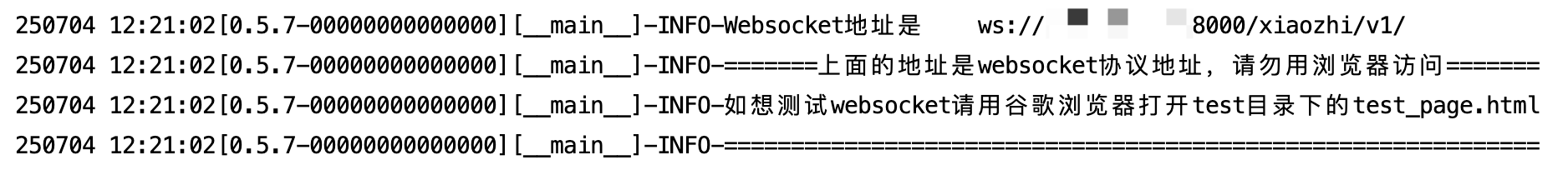 25-02-23 12:01:09[core.websocket_server] - INFO - Websocket地址是 ws://xxx.xx.xx.xx:8000/xiaozhi/v1/