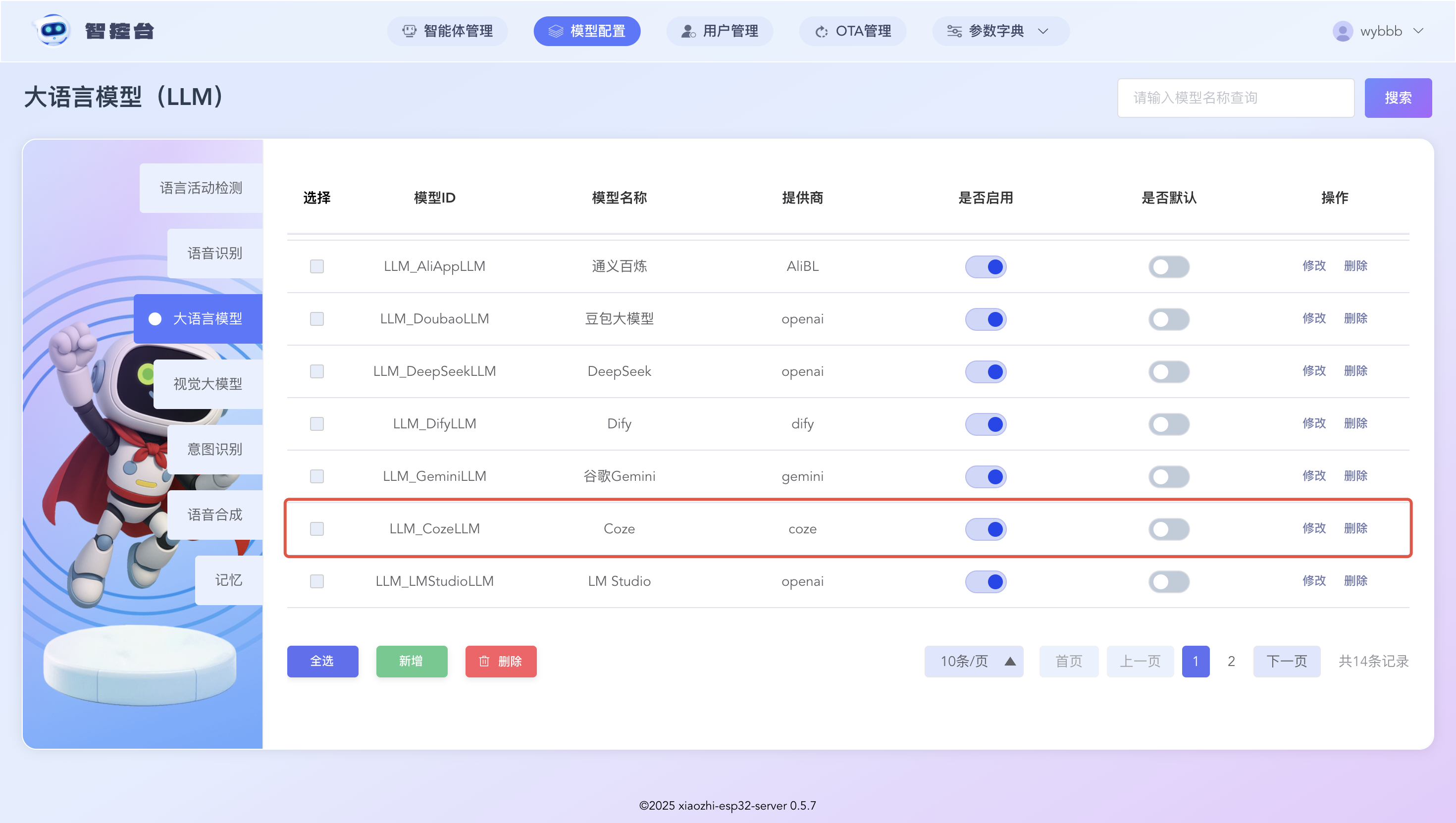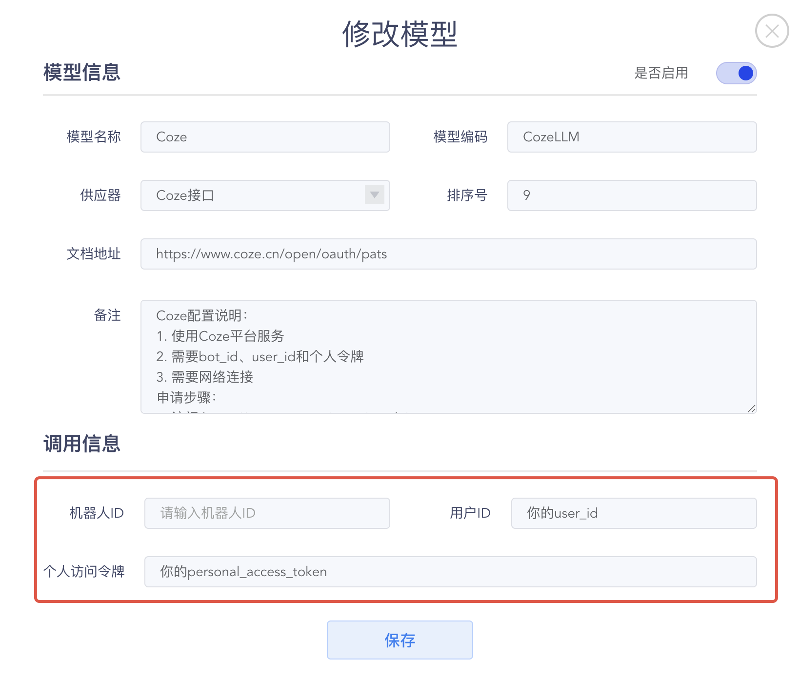 2. 再次进入智控台,在顶部菜单找到模型配置,然后在左侧栏选择【大语言模型】,修改 Coze 模型的配置,填入您的bot ID、用户ID和个人访问令牌。