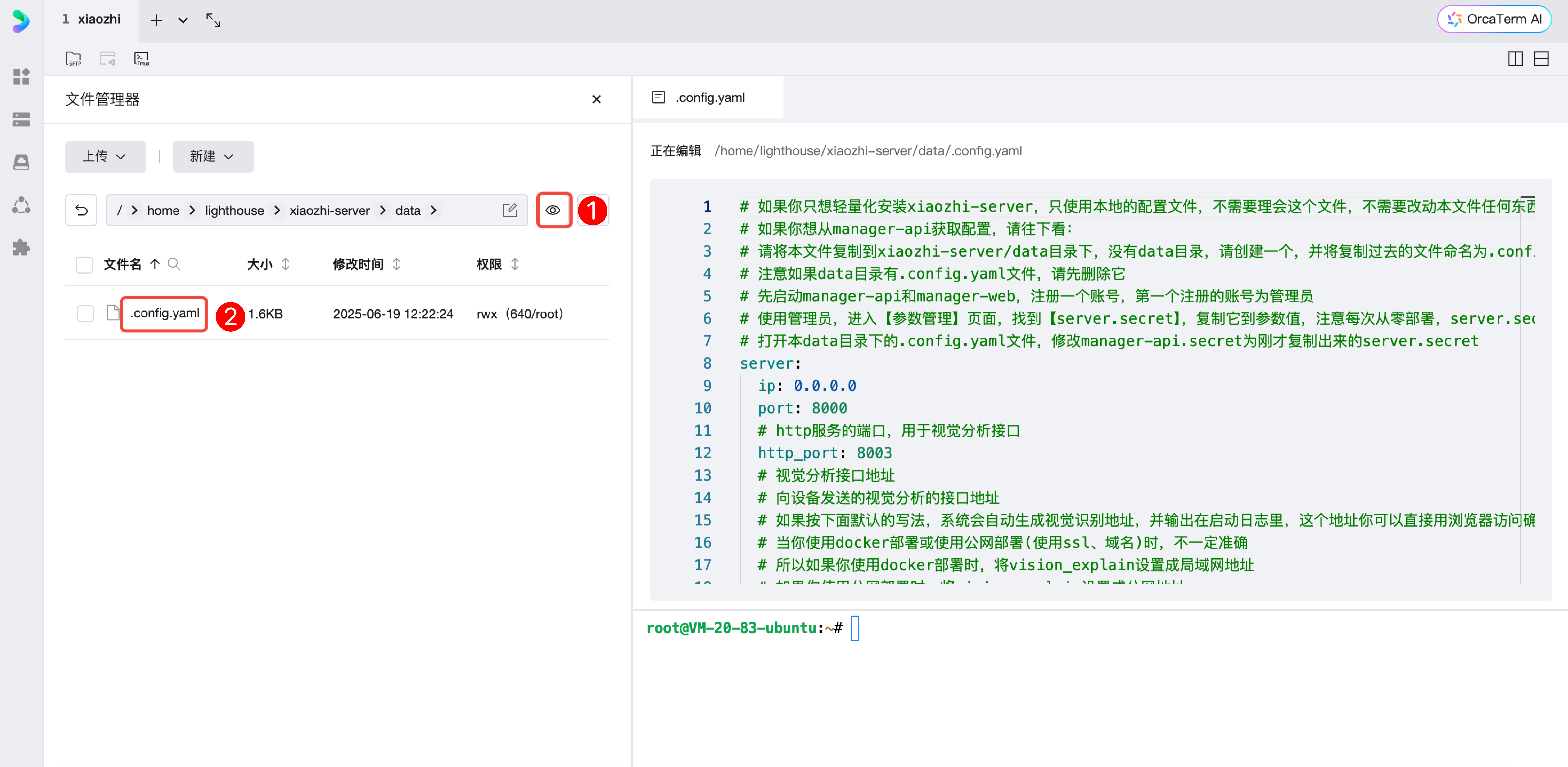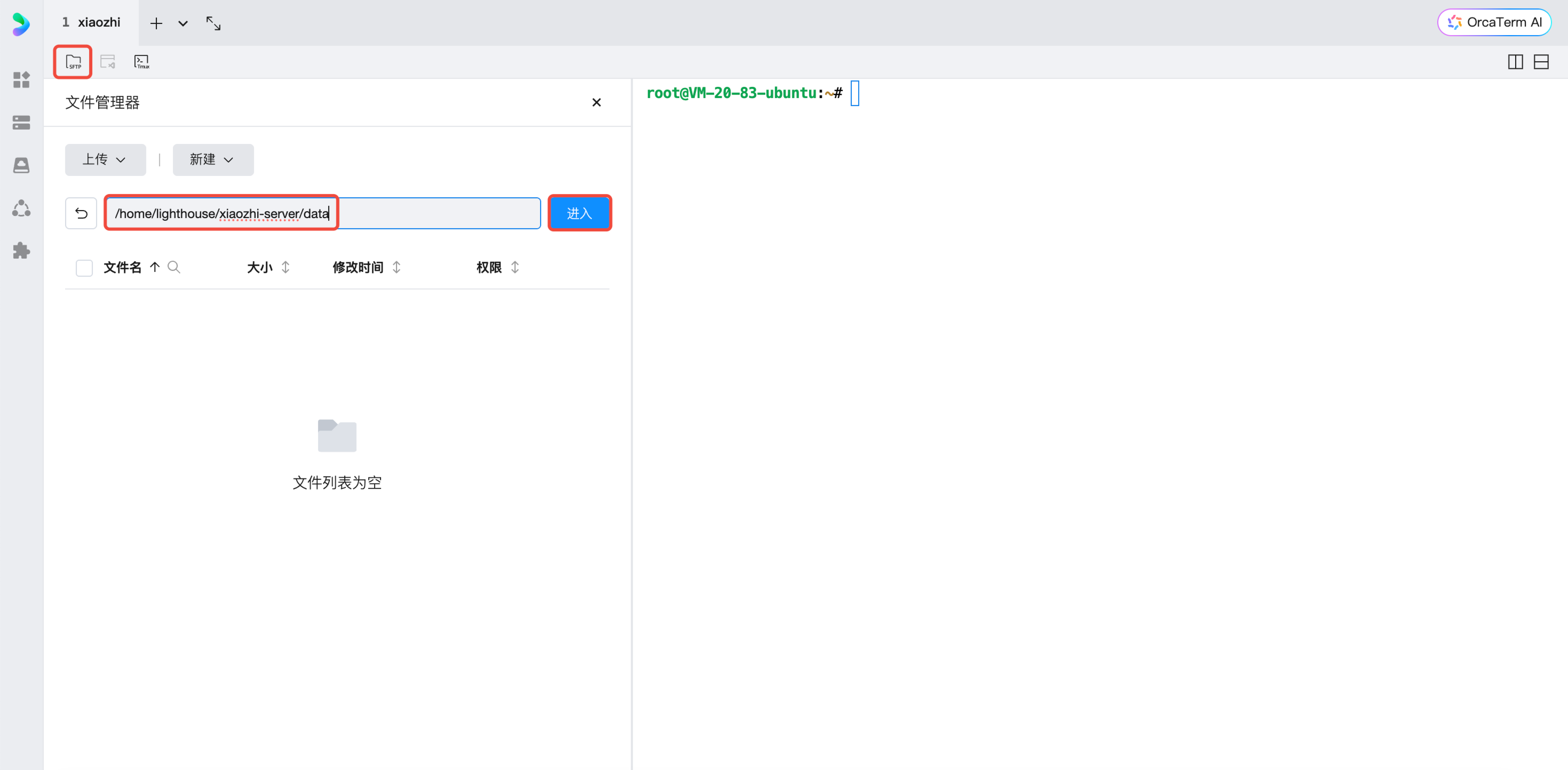 4. 接下来我们要配置项目文件,来到OrcaTerm的文件管理页,进入/home/lighthouse/xiaozhi-server/data。