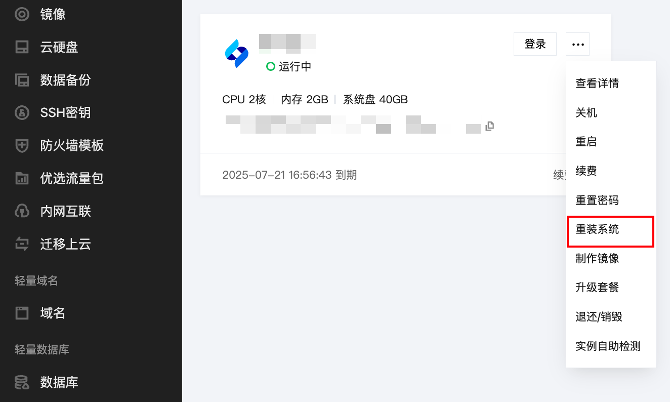 1. 登录轻量云控制台,单击想要配置小智AI服务端的服务器卡片内的【更多】,然后点击【重装系统】按钮。