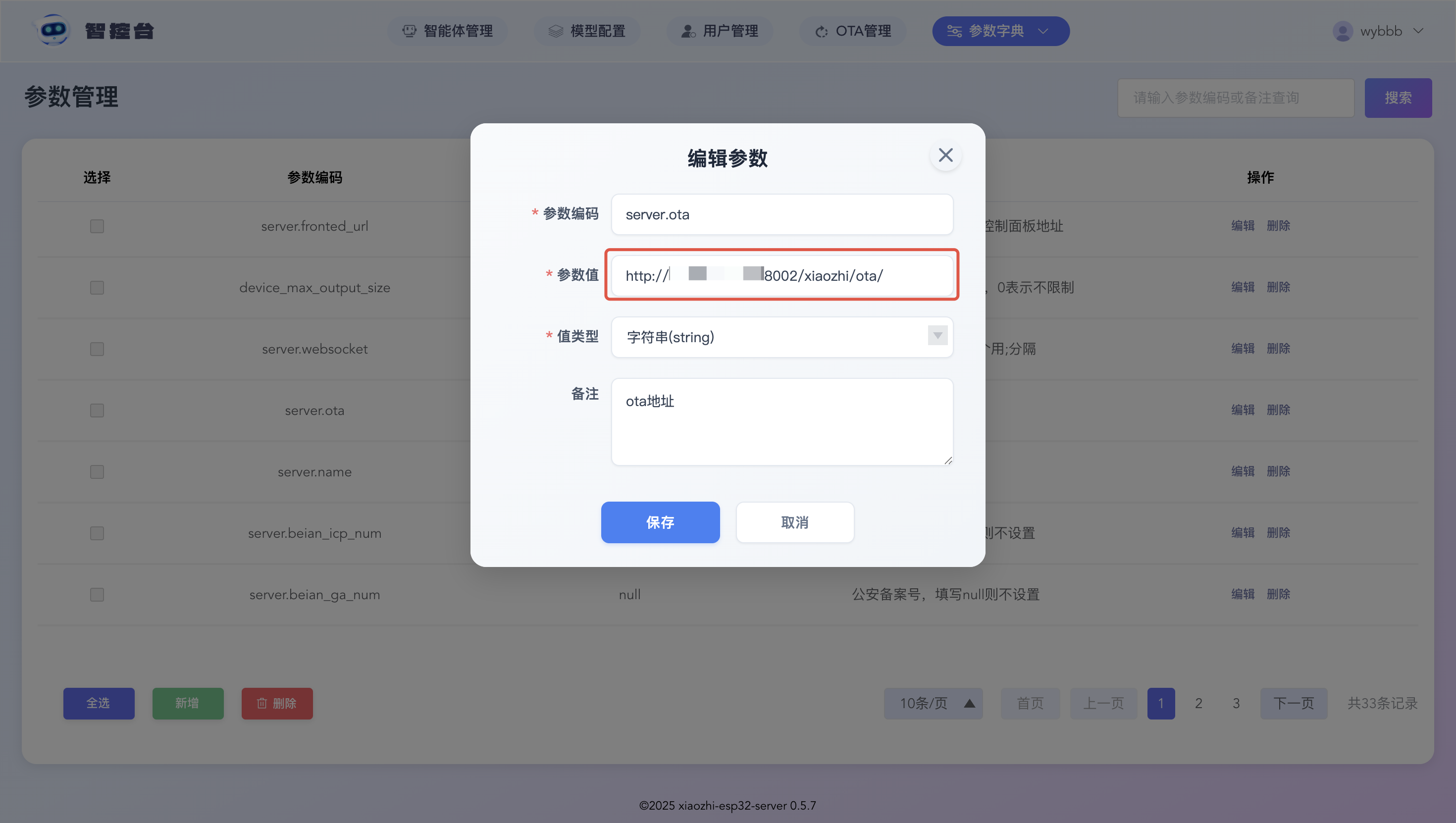 13. 点击参数编码 server.ota 的【编辑】。将参数值修改为http://实例公网IP:8002/xiaozhi/ota/,点击【保存】。