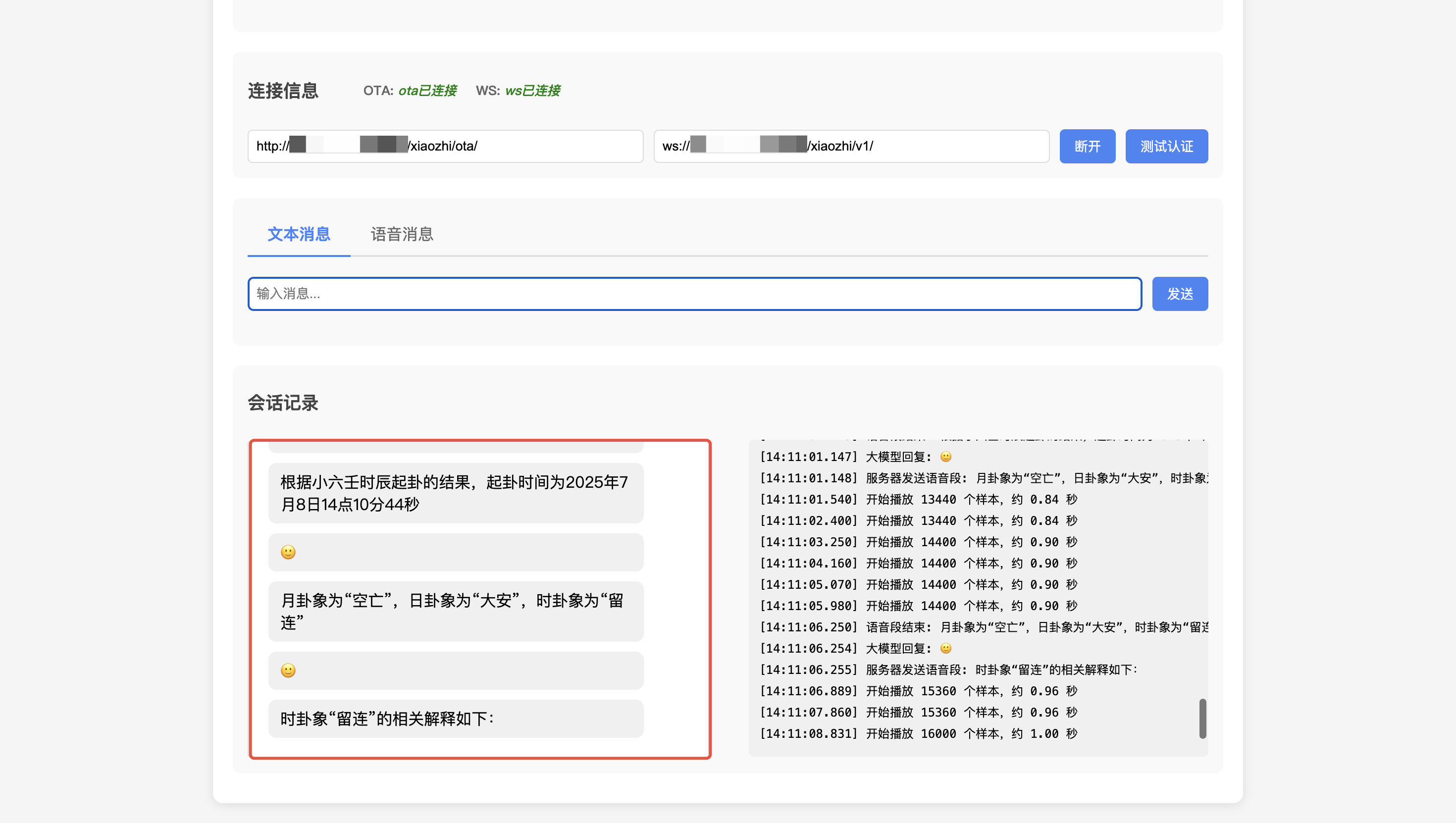 如果连接正常,恭喜您已经成功配置好了小智AI,距离获得私人卦师仅剩50%的操作步骤啦。