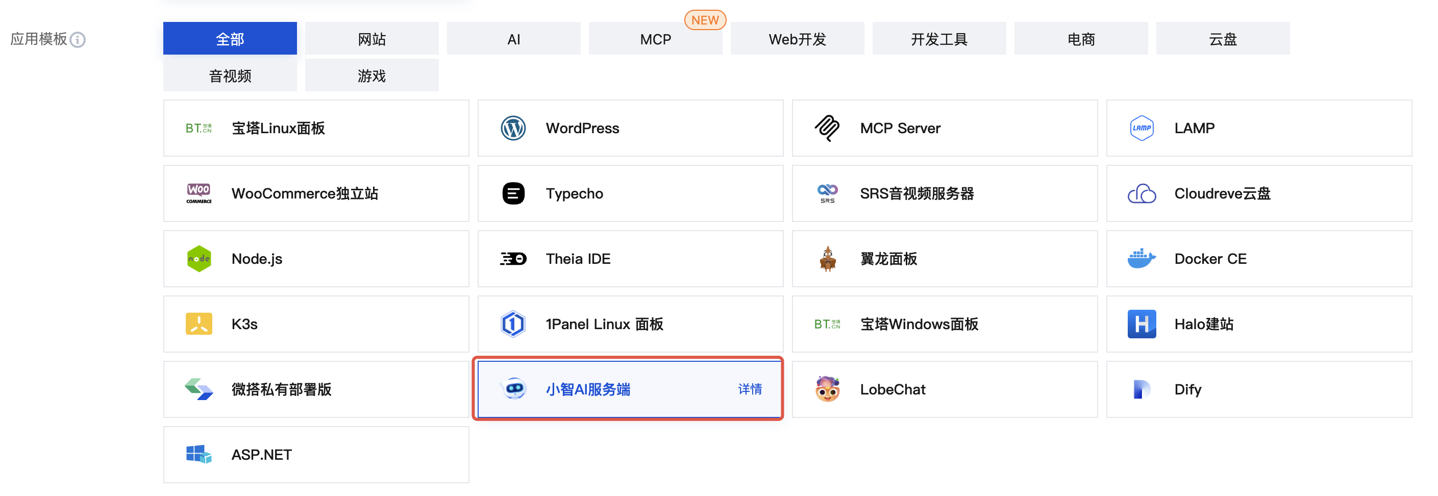Lighthouse提供了小智AI服务端应用模板,内置了小智AI运行的必要环境,无需从搭建容器开始手动配置运行环境,可以更简单方便地使用小智AI构建自己的人工智能。
