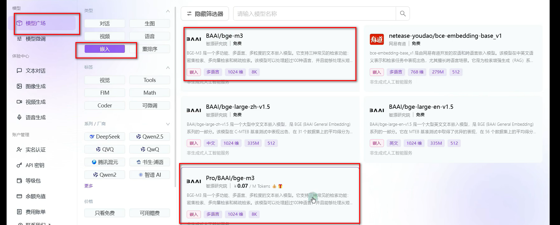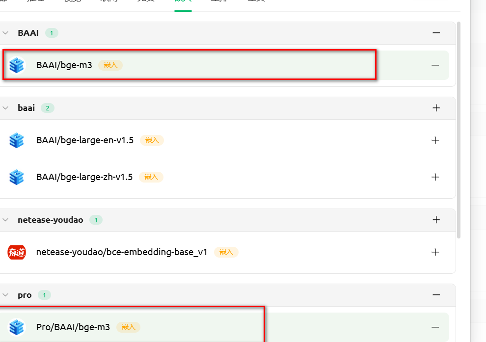 需要关注下面两个嵌入模型。知识库需要用到。
