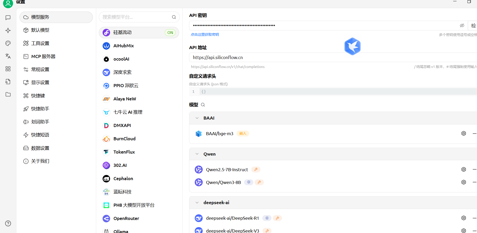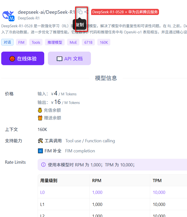 配置下api key。怎么配置?先到硅基流动选择模型,如下图复制模型名字,粘贴拷贝。