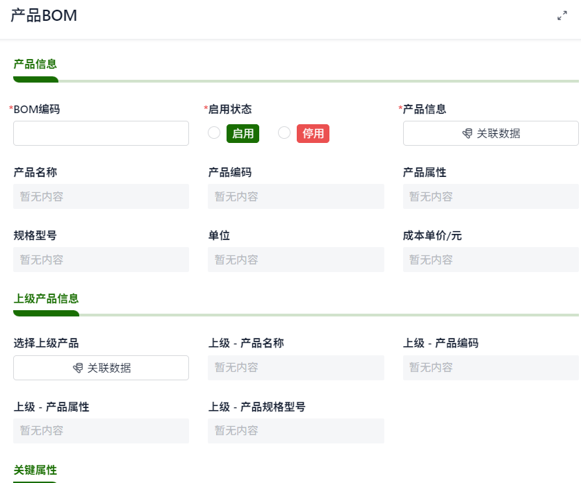 BOM(物料清单)是描述产品所需原材料、零部件及其相互关系的重要工具。在ERP系统中,BOM通常是分层次的,支持一、二、三级等不同层级的BOM。每个层级的BOM都需要记录物料的名称、数量、单位等信息。