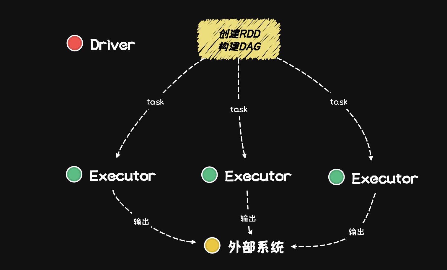 在 Spark 的运行架构中,主要是由两个部分组成的:Driver 和 Executor。Driver 负责创建RDD,然后将RDD拆分成一个个task,然后分发到 Executor 上去执行,这就是所谓的分布式处理,也是一个Spark程序最简单的处理流程。