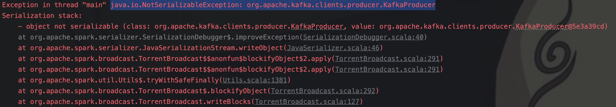 但是在实际的开发过程中,你会发现像一些服务连接以及连接池之类的类,都没有实现 Serializable 接口。我在 SparkStreaming 开发中最多的是与 Kafka、Redis 这一些打交道。我在写入Kafka 的时候就需要用到 KafkaProducer,但是 KafkaProducer 及 Producer 都没有实现Serializable。