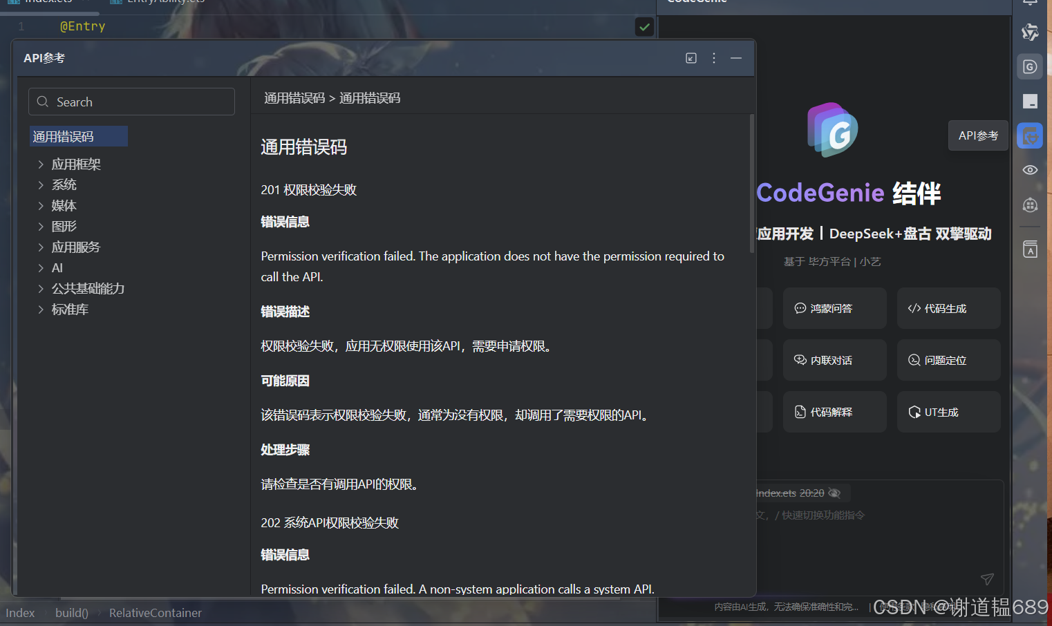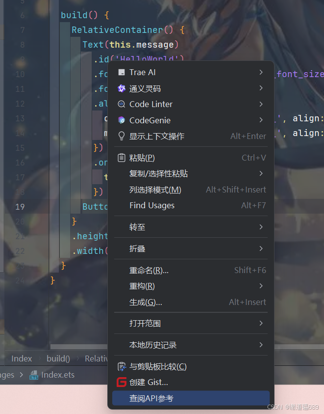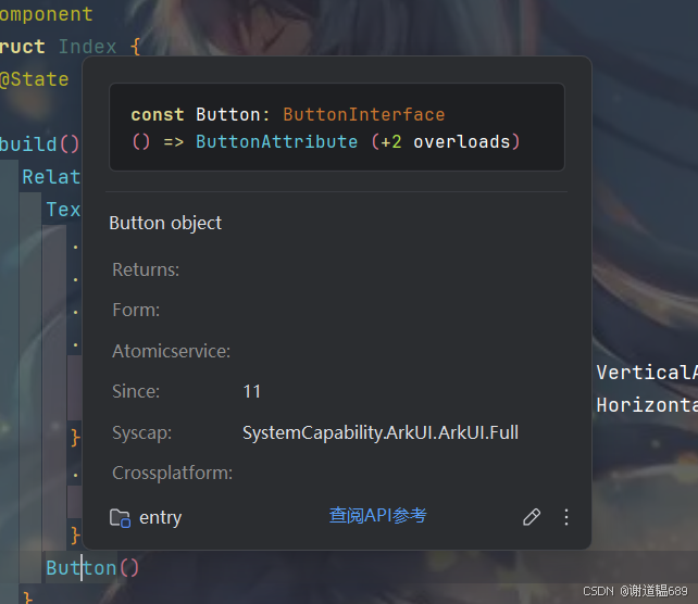 此时会弹出悬浮窗口,显示该 API 的核心信息: 组件 / 方法的功能说明 必选 / 可选参数及类型(如Button的type属性可选值) 版本支持(如 “从 API 9 开始支持”) 简单示例代码片段