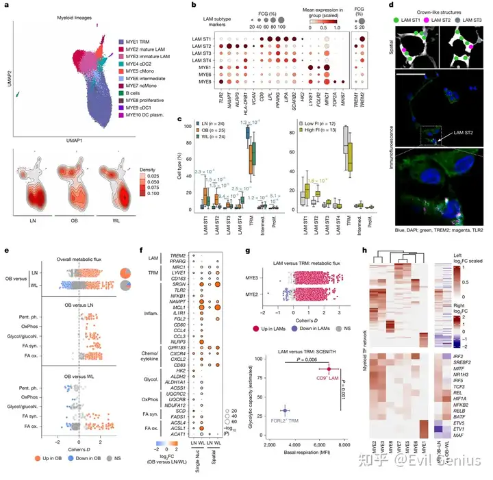 独立于肥胖程度,LAMs丰度与代谢功能障碍呈正相关,提示LAMs可能兼具适应性与适应不良的双重特性。LAMs亚群分析揭示两个主要亚型:溶酶体/代谢主导型(LAM ST1,适应性)与炎症主导型(LAM ST2,适应不良;高表达MHC II、NLRP3)。炎症型LAMs显著高表达TLR2与TREM1——这两种协同受体在病原识别反应中启动并放大炎症。与其有害作用一致,炎症型LAMs在肥胖中数量增加且与代谢功能障碍相关。空间与蛋白分析显示二者功能取向迥异:适应性LAMs聚集于冠状结构(CLS,环绕转录沉默的脂肪细胞),而炎症型LAMs多以孤立或成对形式分布。