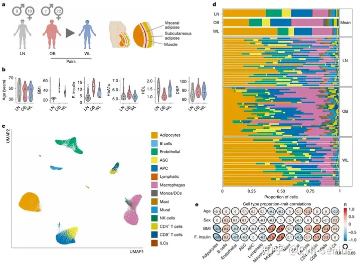 研究揭示人类体重增加及减重过程中皮下脂肪组织微环境的细胞、结构和功能动态变化。通过全组织聚类分析及成分解析,发现肥胖脂肪组织存在广泛的免疫细胞(以巨噬细胞为主,同时包含淋巴细胞)浸润现象。肥胖脂肪组织还表现出成熟脂肪细胞的缺失,提示细胞死亡增加和/或成熟脂肪细胞再生受阻。减重干预可显著缓解这些典型的有害病理改变。