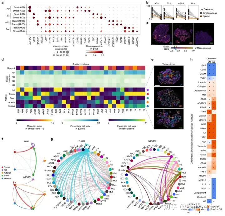 组织分区鉴定能够探究微环境内/间的信号传递模式。空间数据集中的配体-受体推断分析揭示出复杂的通讯网络:脂肪细胞微环境富集脂肪因子和神经营养因子(ADIPOQ、LEP、NRXN3);干细胞微环境以经典WNT和ECM成分(FN1、胶原蛋白、层粘连蛋白)为主;应激与动脉微环境则富含促炎趋化因子(CXCL2、CCL2、IL6)和推定应激信号(TGFB1、AREG、NAMPT、THBS1),部分分子存在功能重叠。在更大规模单核数据集中的并行细胞间通讯分析,将各类微环境信号与源/靶细胞及疾病病理机制相关联。例如,已知参与胰岛素抵抗[32]、免疫糖酵解代谢和炎症的THBS1(应激AD3来源)、ADGRE5(泛免疫表达)和NAMPT(多细胞来源)均在肥胖中表达上调,经减重后逆转,证实应激微环境浓缩了参与病理性与修复性组织重塑的关键信号分子。