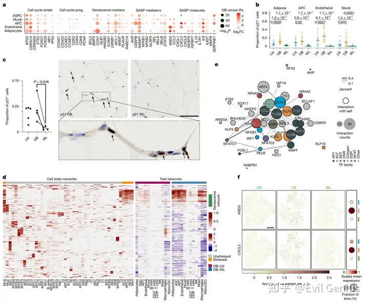 所有应激细胞状态均上调了一组共有基因特征(188个基因)。尽管多细胞应激在肥胖组织中最为显著,但它同样是瘦型组织的特征,且随年龄增长和代谢功能障碍加剧。基因与通路分析揭示了多细胞应激的潜在介导因素(包括缺氧、机械与氧化应激、Gp130介导的细胞因子、DNA损伤及细胞周期阻滞)。体外实验通过依托泊苷诱导DNA损伤,成功重现了对应激标志蛋白的影响及对ASPC分化能力的损害。减重显著降低多细胞应激基因表达,整体强调了多细胞应激通路在组织损伤与修复中的重要作用。