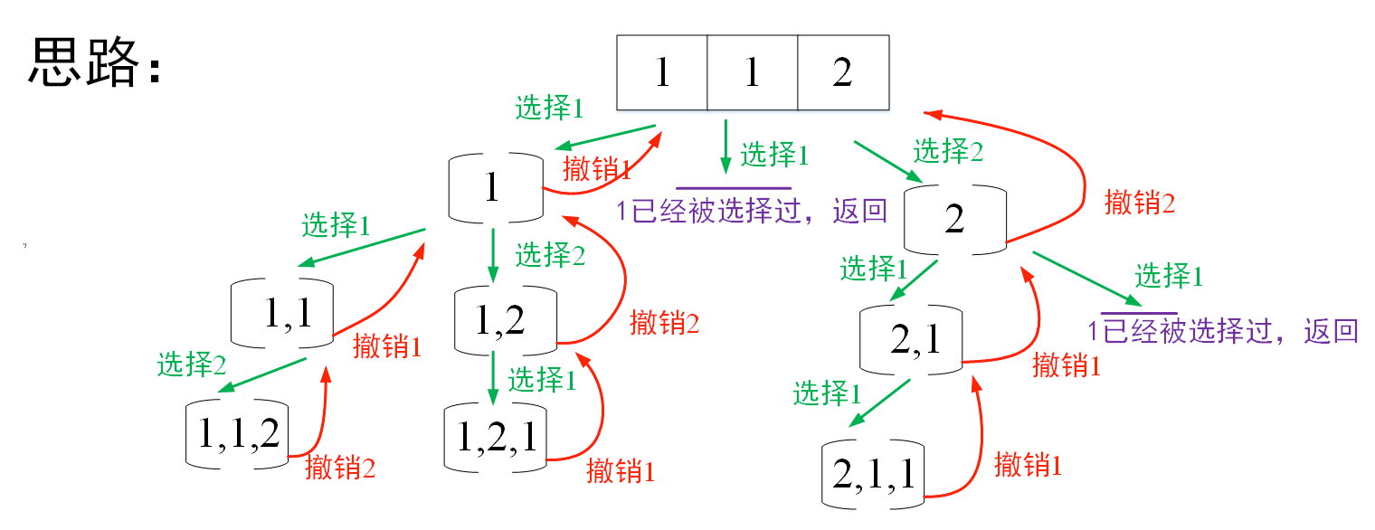 遍历每一个元素,以该元素作为开头的数字数列。首先选取该数字,并标记该数字已经使用过;再递归选择其他数字;撤销该数字,让其他数字作为开头。缩小数字区间:该元素已经使用过;当前元素与前一个元素一样,且前一个已经使用过。