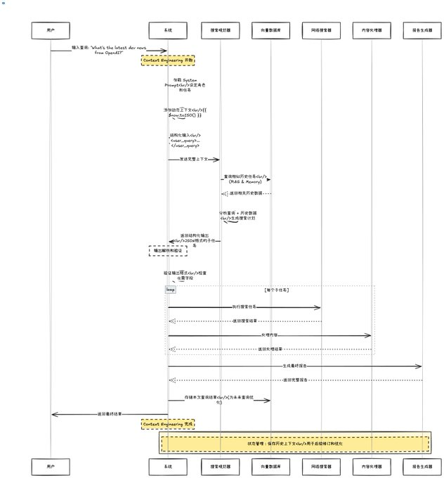 最后我们看一个Deep Research的智能体例子,下图展示了如何从简单指令扩展到包含时间context、输出格式、字段定义的完整系统。Context engineer需要系统思维,精确定义每个组件,动态管理变化因素,持续优化效果。这已成为AI开发的关键技能。