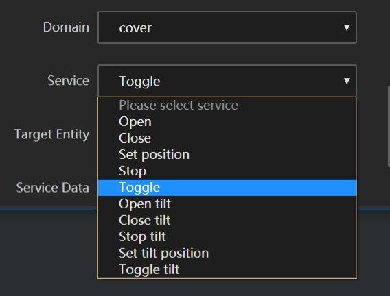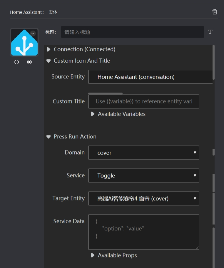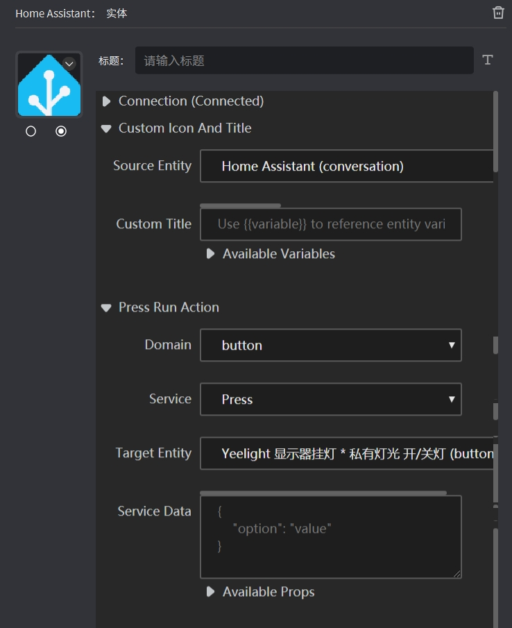 Custom Icon 和 Title主要是配置显示在Ulanzi Deck按键上的信息, 下方的Run Action是配置控制设备功能的区域,比如是开关类的设备,我们首先选择Domain是Button,Service是Press,在Target Entity中选择想要控制的设备,这就完成了一个设备实体的配置。
