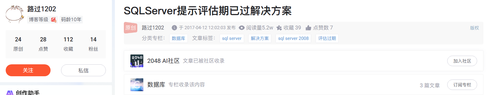 好久没有使用这个SQL server数据库了,结果这个再次点击的时候直接过期了,我真的是非常的无语啊,如果我不解决的话,估计考试的时候我就只能使用机房的这个垃圾的电脑了,于是我自己花时间解决了一下,非常幸运的事最后解决了,中间还是积累了一些经验,所以记录一下;