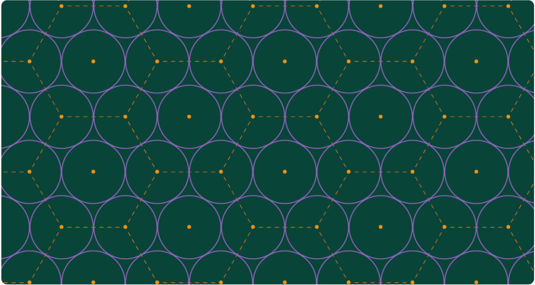1905 年,德国数学家赫尔曼・闵可夫斯基(Hermann Minkowski)建立了一种直观的方法来思考堆积球体。首先,我们先从空间中重复排列的点开始,称为「格」(lattice)然后围绕每个点画一个球体。这样,在给定维度中寻找最优球体堆积的问题实际上变成了寻找一个点排列尽可能高效的格子的问题。例如,在二维空间中,最优格子是「六边形」,其堆积形式如下: