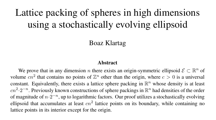 如今,数学家 Boaz Klartag 在四月份发表的一篇论文《Lattice packing of spheres in high dimensions using a stochastically evolving ellipsoid》中,新方法以显著优势打破了之前的记录。一些研究人员甚至认为,他的结果可能接近最优解。