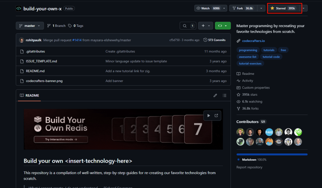 最近在 GitHub 上发现了一个宝藏项目,叫"Build Your Own X",目前已经有 39.5 万个星标,在 GitHub 上排名第二,堪称是造轮子的鼻祖。