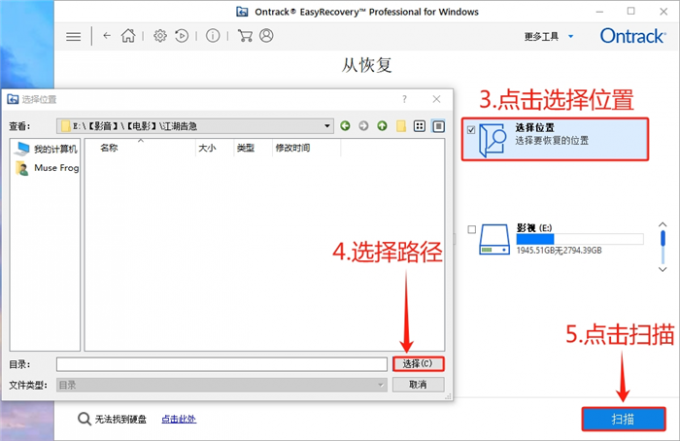 点击“选择位置”,选择被永久删除的文件路径(如果忘记具体路径的话,勾选整个盘符即可),点击“扫描”按钮。