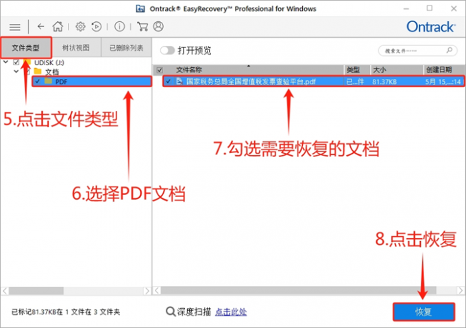 在“文件类型”列表中,取消所有文件的勾选后,选择需要恢复的 PDF 文档。然后,勾选视频文件,点击“恢复”即可。