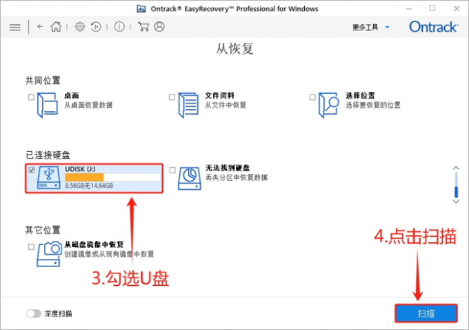 外接的存储设备,大都不具备“回收站”功能。因此,在 U 盘中按 Delete 键,电脑就会提示“永久删除”。并且,被删除的文件,不会移入电脑回收站所在的硬盘。因此,若想恢复 U 盘中的文件,则需要使用 EasyRecovery 数据恢复软件扫描 U 盘路径。
