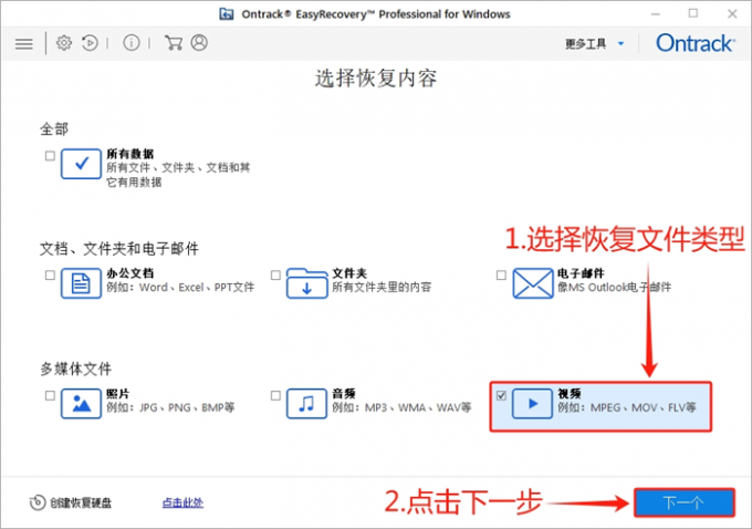 首先,打开 EasyRecovery 数据恢复软件的主界面,勾选“视频”文件格式后,点击“下一个”。