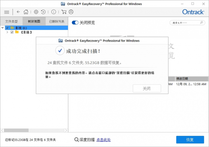 扫描结果显示,找到了 55.23GB 的可恢复数据。