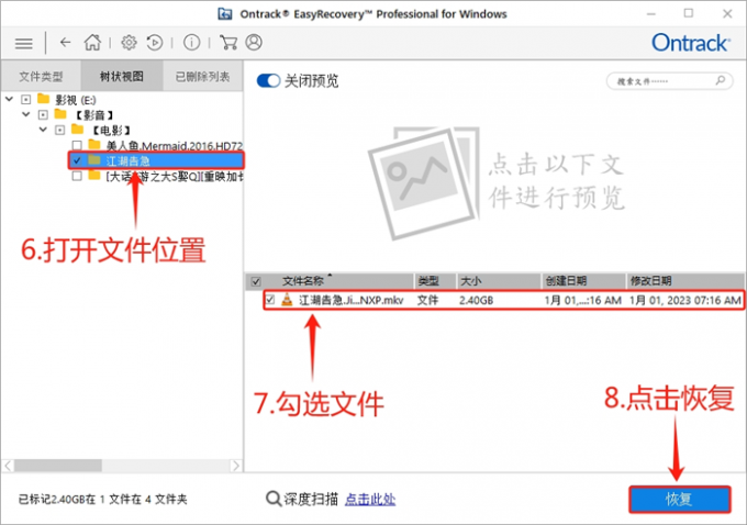 在“树状视图”中,取消所有文件的勾选后,找到需要恢复的电影文件 。然后,勾选电影文件,点击“恢复”即可。