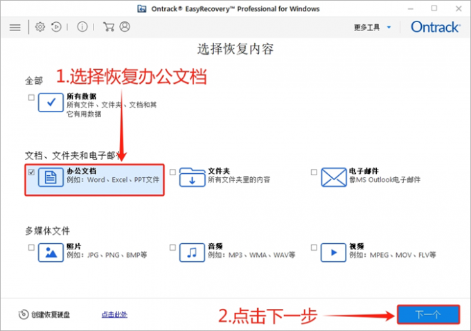 首先,打开 EasyRecovery 数据恢复软件的主界面,勾选“办公文档”文件类型后,点击“下一个”。