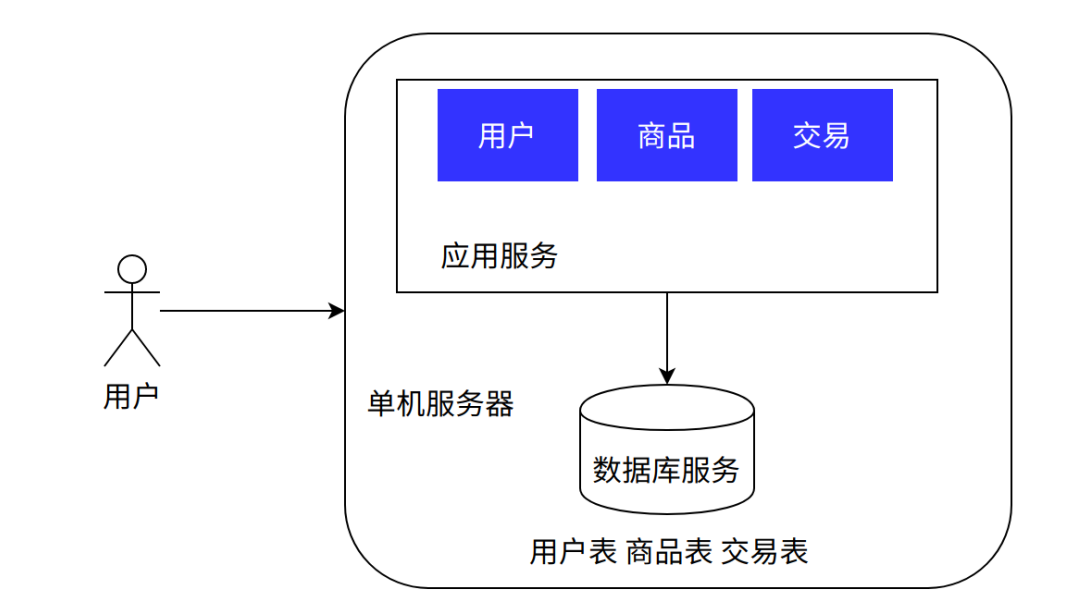 下面以电子商城为例,可以看到通过应用(划分了多个模块)和数据库在单个服务器上协作完成业务运行。