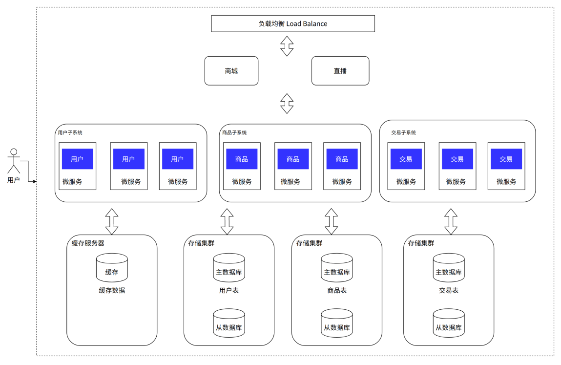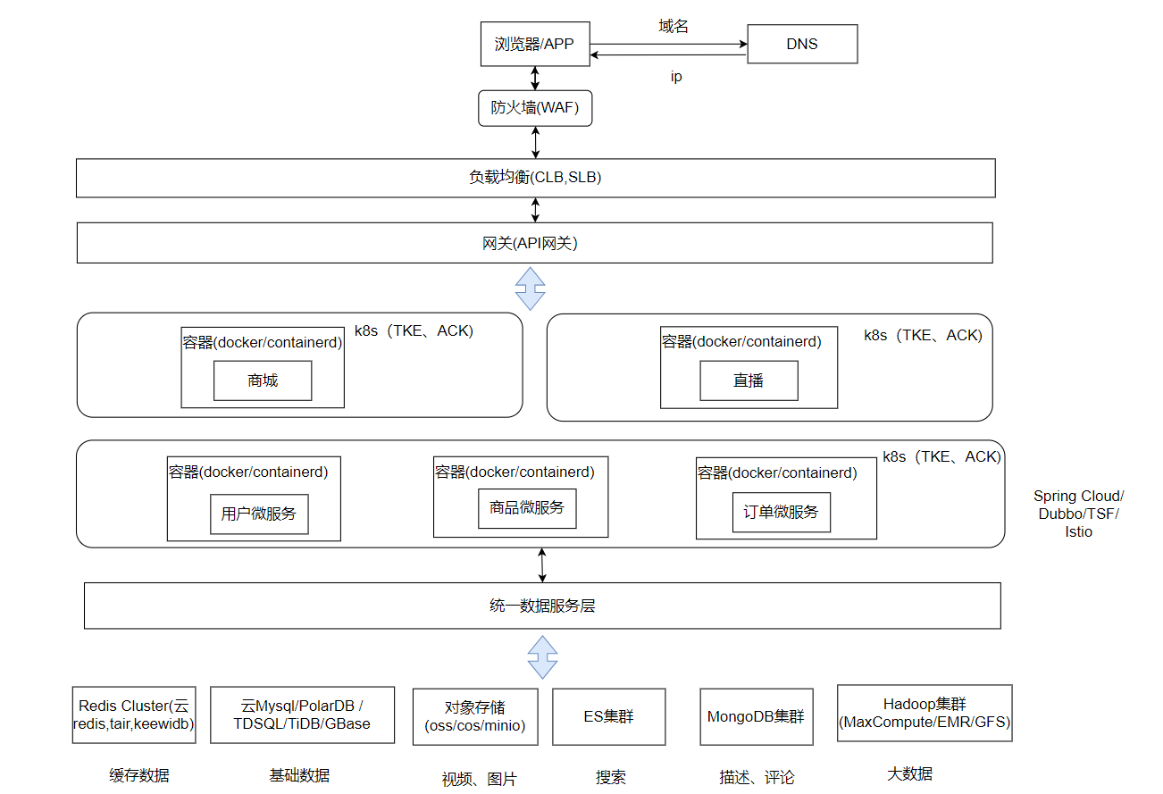 以电子商城为例,可以看到应用不再是一个,而是变成了多个,通过负载均衡来支持海量的并发。