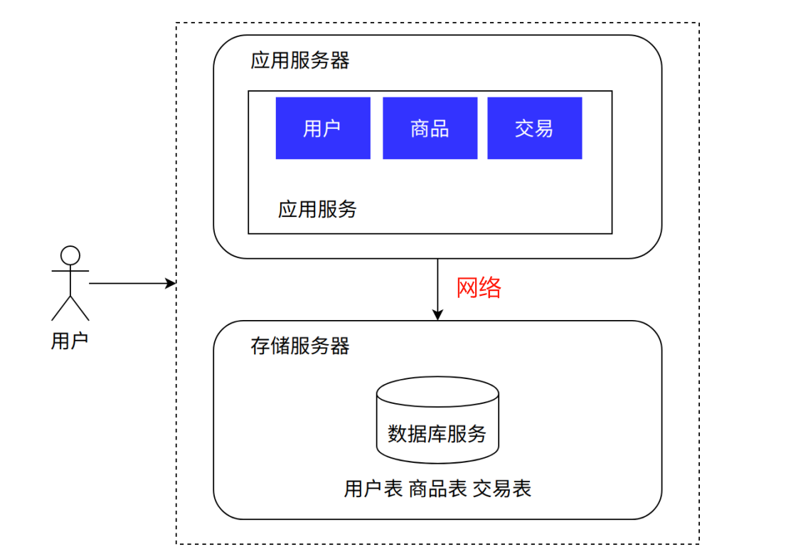 以电子商城为例,可以看到 应用和数据库在各自的服务器上通过网络协作完成业务运行。