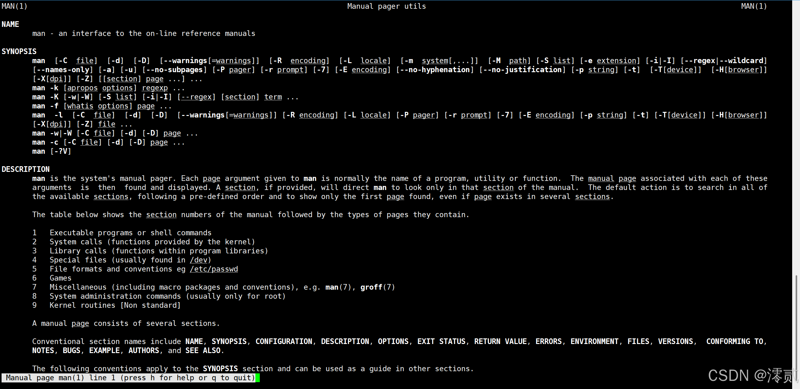 -f 即使文件属性为只读(即写保护),亦直接强制删除-i 删除前逐一询问确认-r 删除目录及其下所有文件(递归删除)[zzh_test@hcss-ecs-6aa4 ~]$ man manman 指令用于查看指令手册,毕竟不可能记住所有的指令,man man 是查询 man 这条指令的意思